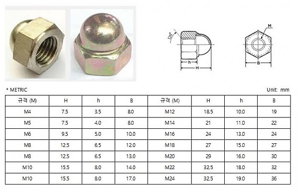 캡너트 페이지 정보 글쓴이 관리자 작성일2014-10-15 13:31 조회1,713회 본문 캡너트 특징 육각너트에 둥글게 마감처리 한 것으로 외관상 깔끔한 처리를 위해서 사용 이전글 다음글 목록